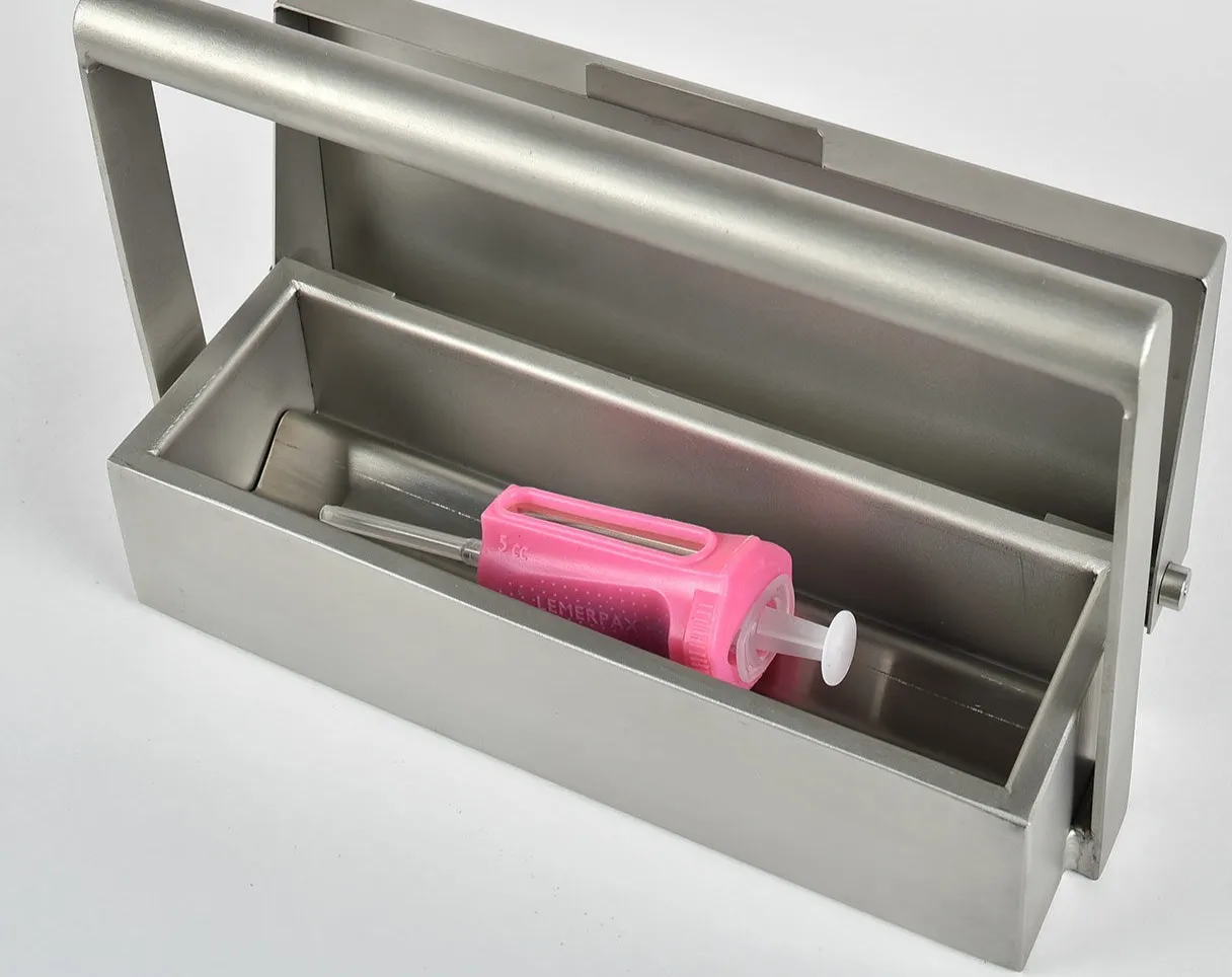 Der Medikoffer ist ein abgeschirmter Transportbehälter für Spritzen mit radiopharmazeutischen Substanzen, geeignet für Spritzen von 1 bis 10 ml.